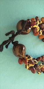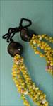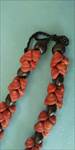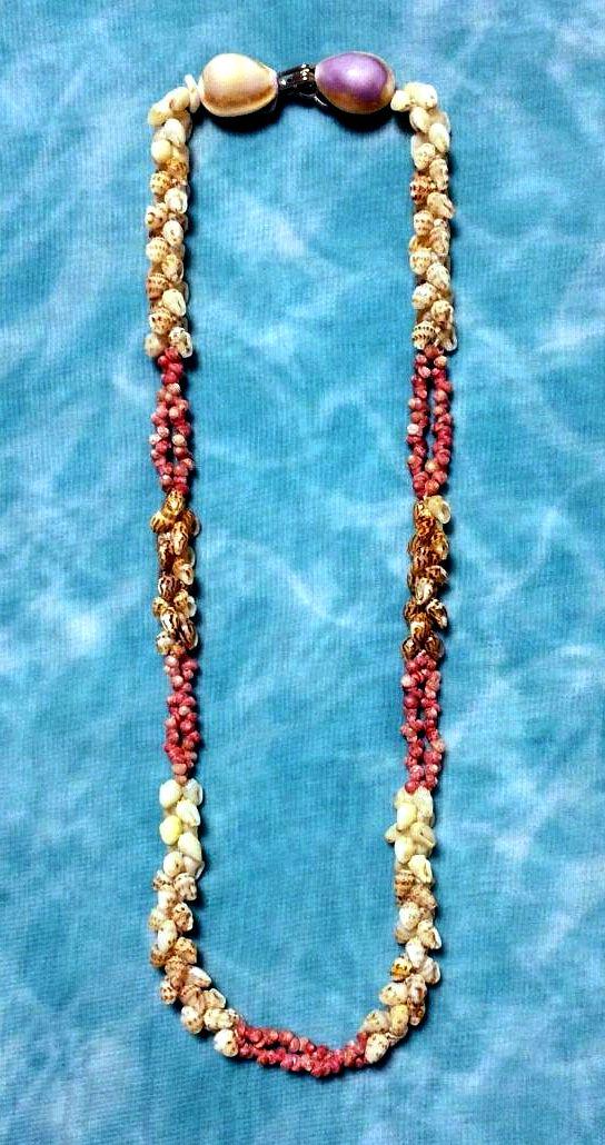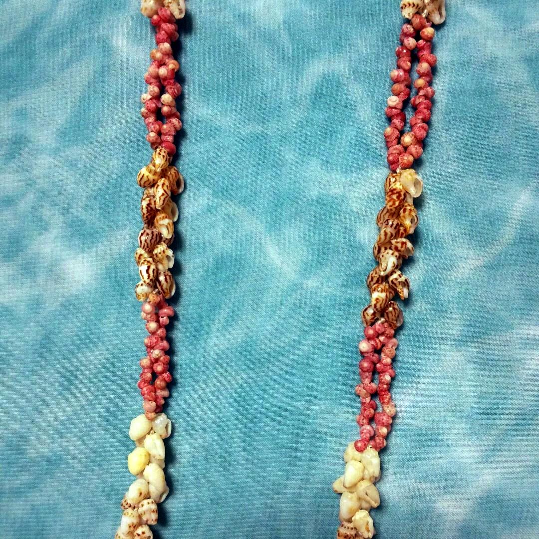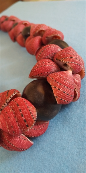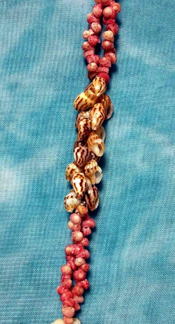 ストロベリー、という見た目のまま忠実に命名された貝をポエポエというくるくる回るという意味の編み方で整え、アクセントにククイの黒い実を配置してあります。
