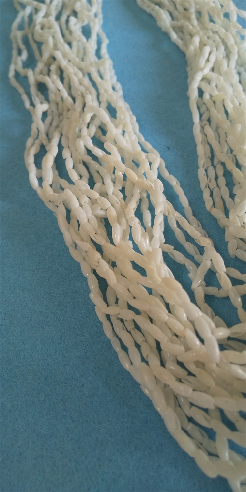 薄い貝殻はギザギザがありますが同じ向きに編み上げれば違和感がありません。